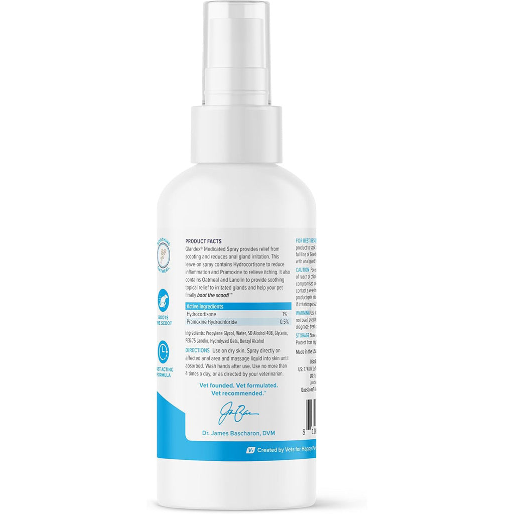 Glandex® Anal Gland Medicated Spray provides fast relief for pets suffering from anal gland issues. It is a vet-recommended, easy-to-use solution that reduces inflammation, relieves itching, and helps control scooting and discomfort. With soothing ingredients like Oats and Glycerin, this spray is safe for daily use and helps maintain your pet's comfort and hygiene.